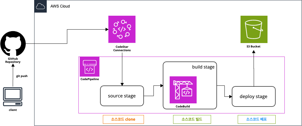 - GitHub Repository의 소스 코드를 git clone, 빌드하여 S3 Bucket에 배포하는 다이어그램입니다.