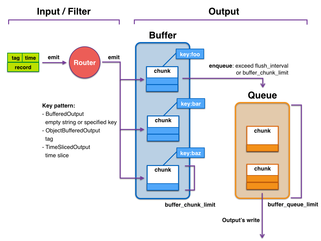 fluentd가 flush하는 구조를 보면 다음 그림과 같이 buffer file에 tag값과 time 키값으로 chunk가 쌓이게 되고 flush_interval 에 설정된 시간이 지나거나 buffer_chunk_limit가 초과하게 되면 enqueue가 발생하게 됩니다.